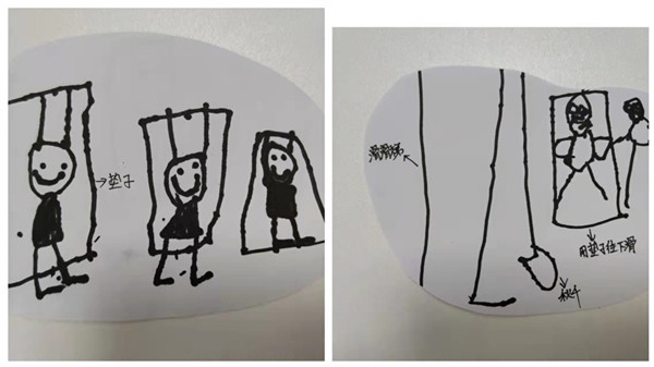 接着承承再一次将垫子拿到滑滑梯的上面,尝试再滑行一次,这一次他将垫子竖着放在滑滑梯上,小屁股压在垫子上,双手紧紧的抓住滑滑梯的两边,脚往前一蹬,“哗“的一下,垫子就带着承承从滑滑梯上冲了下来。承承开心坏了,开始反复的用垫子滑行起来,并且呼喊旁边的小伙伴,一起进行滑行。承承回到班级后,用笔将自己滑行的过程画了下来呢!