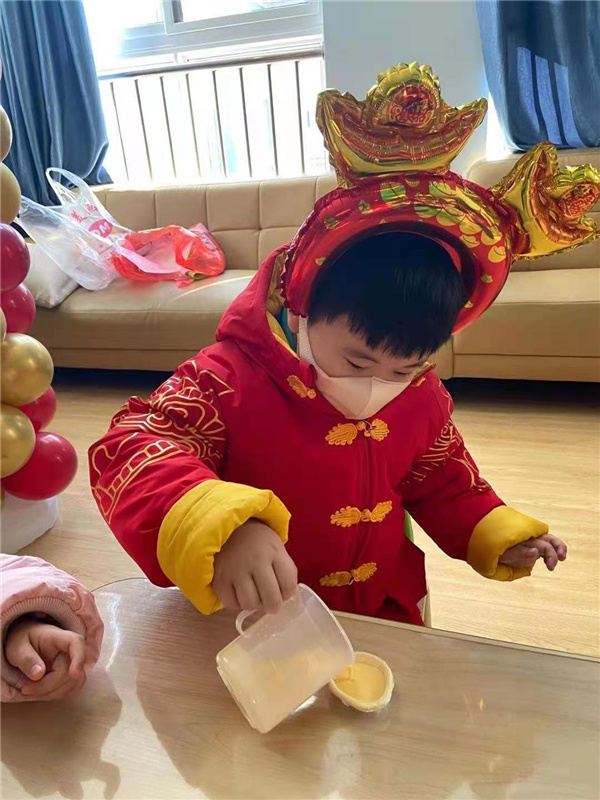 清晨,迎着初升的朝阳中一班的小朋友穿着可爱又漂亮的唐装不畏天气的严寒,蹦蹦跳跳的来到了城堡幼儿园,好似从画中走出的年娃娃。为了让宝贝们进一步感受新年的快乐,烘托新春的氛围,老师们也提前将教室环境布置了起来,和宝贝们一起欢度新年,制作美味。