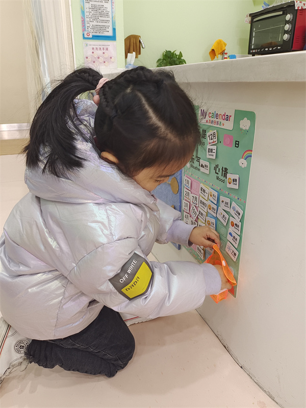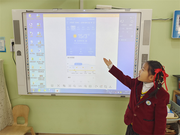 在日常教育中,教师也不断渗透关于天气的认知,并再次捕捉到了幼儿的兴趣和知识点,师幼共同制作了记录天气的天气预报板,引导每天的小值日生记录天气。板上分别有日历、今日日期、以及各种各样天气标志。在活动中,幼儿积极参与,了解了天气符号的科学定义,乐于观察天气现象。