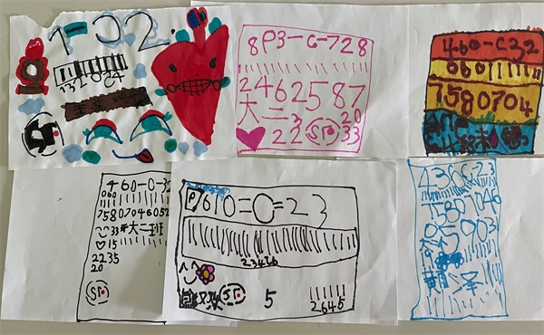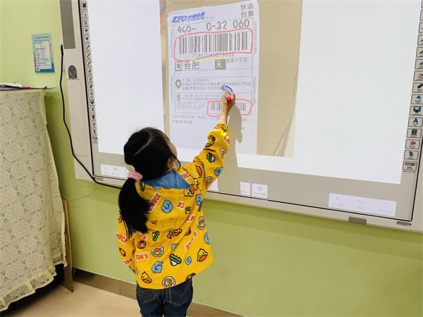 依据孩子们关于快递单的讨论,教师利用电子白板让幼儿直观感受快递,了解快递单包含的内容,鼓励幼儿用白板笔圈出快递单上的收、寄件人位置,了解收件人姓名等信息写在寄件人上面,便于快递员快速区分。孩子们兴致勃勃的设计起自己的专属快递单,尝试用爱心、花朵等卡通图案代替收、寄件人的标识,你一言我一语的讨论着,有趣极了。