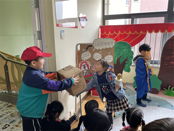 快递站的工作人员摇动铃铛,大声呼喊吸引小朋友们来寄快递,可依旧无人问津。快递员抱着快递却发现收件人不在教室内。教室里的人都去哪啦?原来大家都被表演区的戏剧吸引住了,坐在那当起了小观众,快递员阳阳在获得教师的同意后,阳阳抱着快递送给了正在主持的熙熙,完成了这单快递的运送。