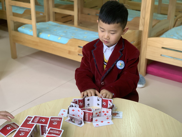 游戏时间开始啦,小朋友们玩得不亦乐乎,有的孩子在建构区利用扑克牌等材料搭建“城堡”、“房子”;有的孩子在数学区有条不紊的进行数的分合;图书区的小朋友遨游在知识的海洋里,津津有味地聊着书里的内容;心灵手巧的幼儿在益智区玩着“弹球”游戏。