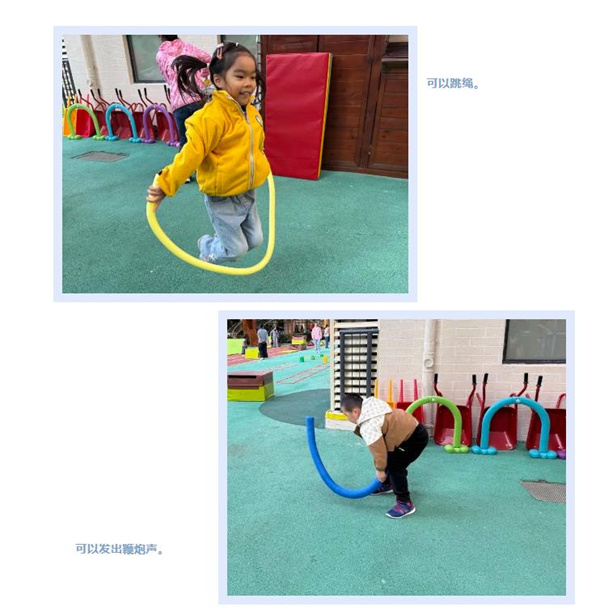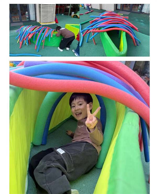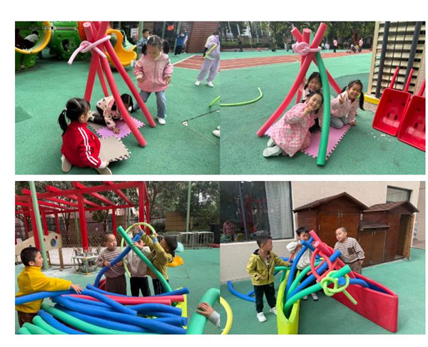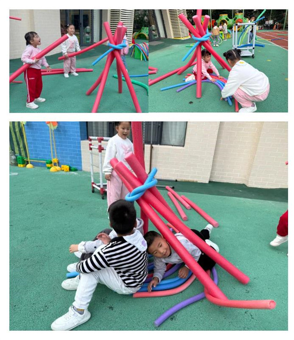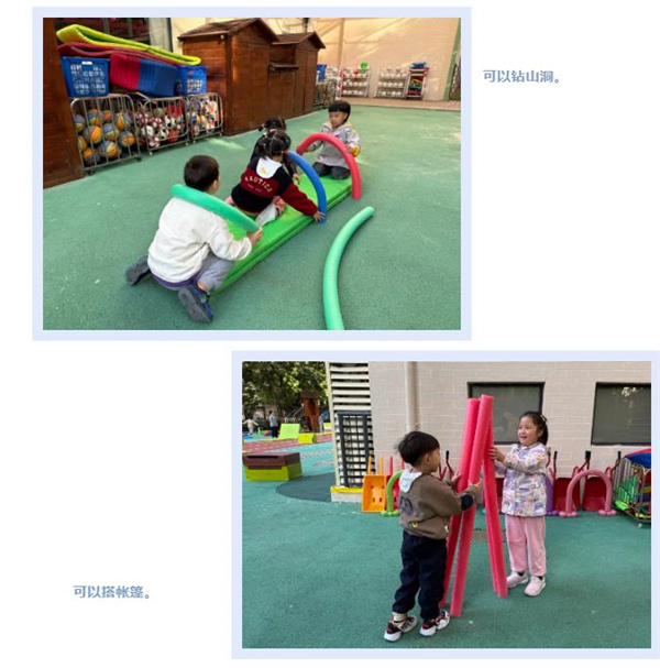 游戏中,一组小朋友用3根粗的浮力棒当作帐篷的支柱,辅助细浮力棒固定上方连接处,但不够稳固松手后易倒塌。另一组小朋友在帐篷外围放置了一圈椭圆形地垫,松手后可保持帐篷形状。