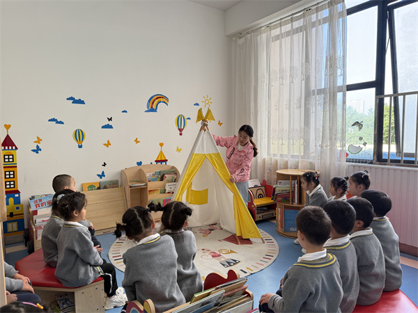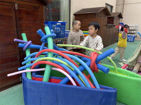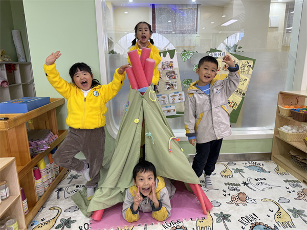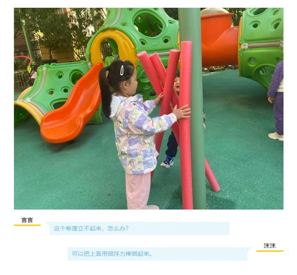 在游戏后的分享环节,关于浮力棒的多样玩法引发了孩子们的热烈讨论,其中“搭帐篷”是他们最感兴趣的内容之一,基于孩子们的兴趣点,帐篷的故事开始了……