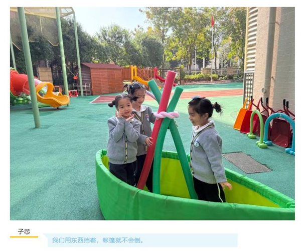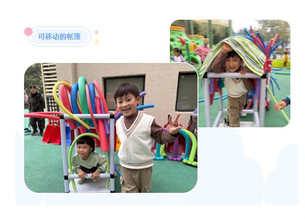 《纲要》中指出:善于发现幼儿感兴趣的事物、游戏和偶发事件中所隐含的教育价值,把握时机,积极引导。在这场探究之旅中,教师和孩子们在动手中学习、在观察中学习、在体验中学习。每一次的结束都将是一次崭新的开始,由帐篷延伸出的游戏还在不断地继续。例如:会移动的帐篷?大二班教师将追随幼儿的兴趣,把游戏与学习融于孩子们的生活,助力幼儿多维经验的发展,让智慧与创造留在了他们的眼中、手中与心中。