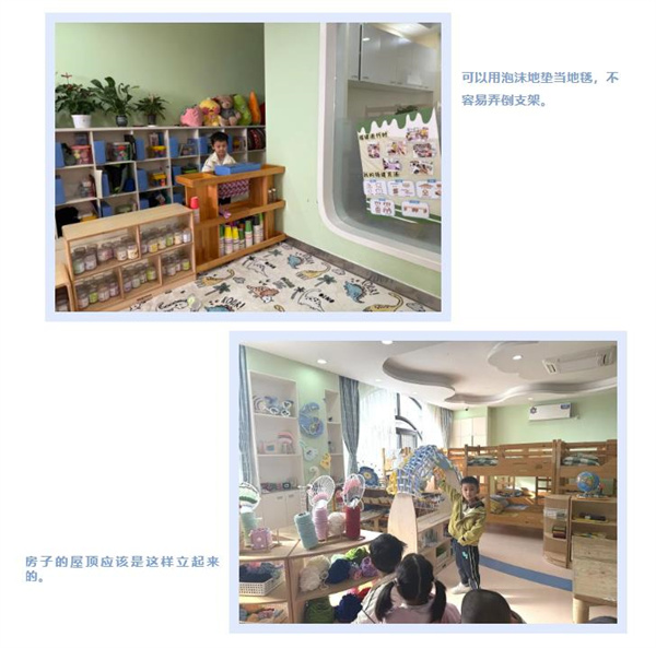在二次复盘中,教师提醒幼儿对比两个三角形帐篷的区别,以及房顶为什么立起来了?引导幼儿通过观察得出以下结论:1.将支架固定在大长方形地垫的四个拐角空间更大,可容纳人也更多。2.再加入一张环形地垫,利用地垫空隙,将两根粗浮力棒插在空隙内交叉,两个人扶着,一个人用细浮力棒打结,立体的屋顶就做好了。