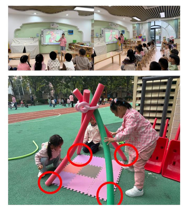 为了帮助幼儿解决帐篷立住不倒塌的困惑,教师组织幼儿观察游戏照片,复盘分析帐篷倒塌的原因,并邀请成功立住帐篷的幼儿分享经验,提炼帐篷支架支撑的要点。