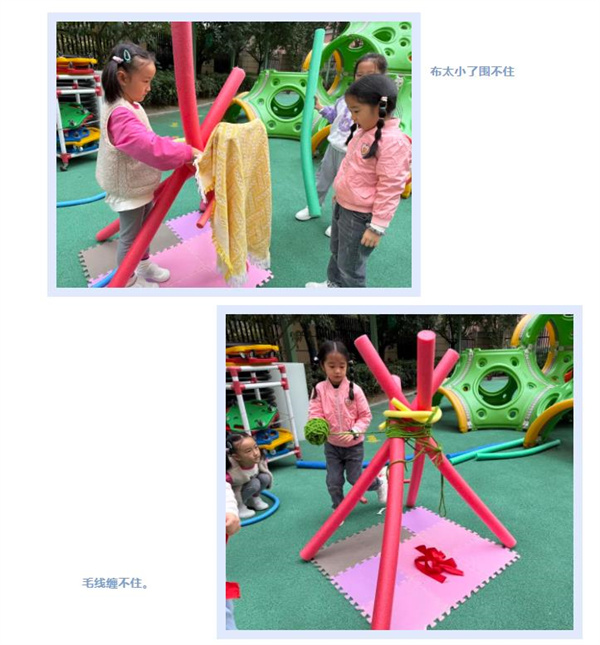 经过不断尝试,小朋友们发现篷布的大小、材质的选择,在进行围合、缠绕时都会产生不同影响,同时也发现了新的问题:如何固定篷布?