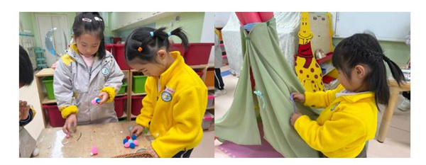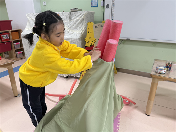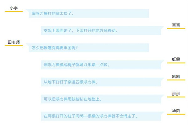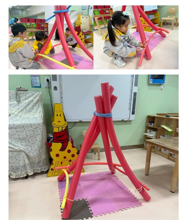 经过讨论,小朋友们利用三角固定的方法让自己的帐篷更稳定,对于多出来的浮力棒也进行了切割,让帐篷更美观。小朋友们用绑、系等方法固定帐篷围布,其中几名幼儿想到需要在帐篷的一边留一个口作为帐篷的门,并用小木夹代替拉链完善帐篷。