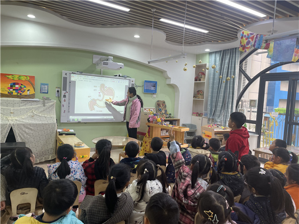 初期的亲子探索,幼儿初步了解器官作用,亲子活动激发幼儿对身体内部器官极大的兴趣,孩子们很想知道身体器官的秘密,因此老师开展了集体活动学习绘本《肚子里有个火车站》、观看肠胃运作视频活动。