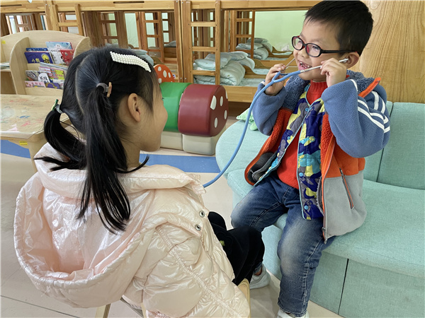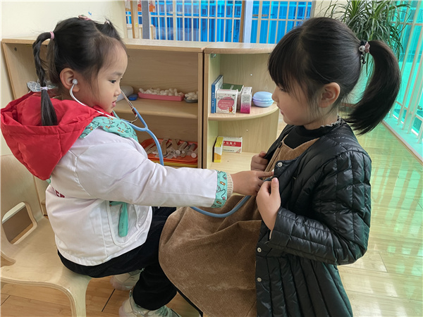 幼儿积极参与倾听心脏活动,在不断探索的过程中幼儿清晰找到心脏的位置上,感受心脏跳动的神奇。心脏主要功能是为血液流动提供动力,把血液运行至身体各个部分,心脏位于胸腔中部偏左下方体积约相当于一个拳头大小。听诊器就像个扩音器,心脏跳动的声音好像是在敲鼓,孩子们来到小医院互相听一听心脏的声音。
