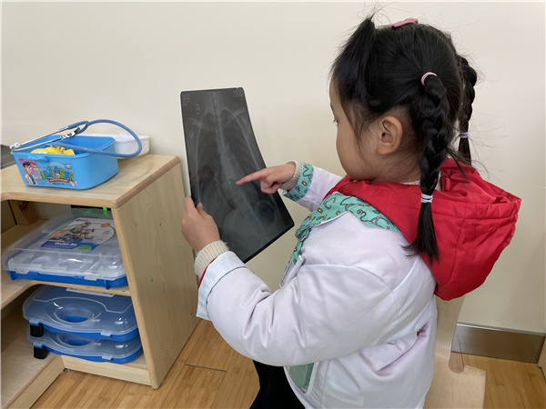 孩子们说,我们在“小医院”看到X光片,我看到有人体的骨骼,我们身体的骨骼是不是最坚硬的。带着孩子们的疑问,我们接着探索人体骨骼。孩子了解到,骨骼虽然坚硬,但是也需要我们保护,该怎样保护我们的骨骼呢?