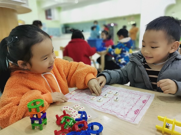 当区域游戏音乐响起时,只见孩子们自己取出棋盘,找到对手并制定好游戏规则后,便各就各位在棋盘面前两两对坐。活动中每一位孩子似乎都胸有成竹,一颗颗棋子在孩子阵阵思考中一一落下。有的孩子开始举棋不定,不知棋落哪为佳,而有的则落子干脆,从容以对,输了的孩子也没有气馁,一句干脆利落的“再来”,又马上投入到新的一轮比赛中。