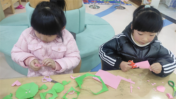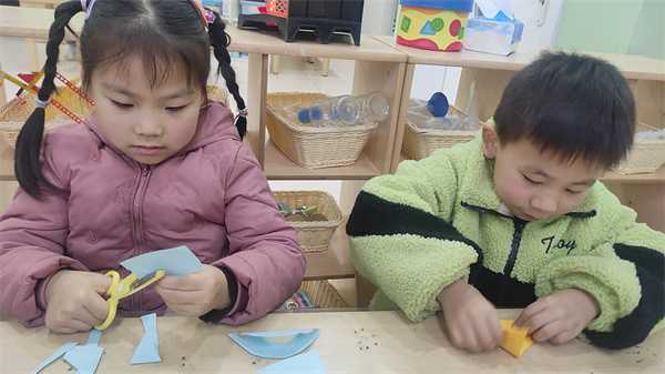 孩子们怕光秃秃的小树会觉得孤单,纷纷拿出剪刀和彩纸,想给小树送上自己的礼物。