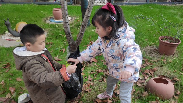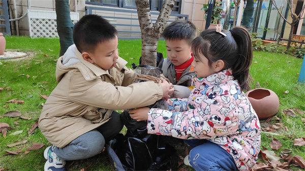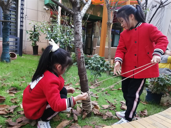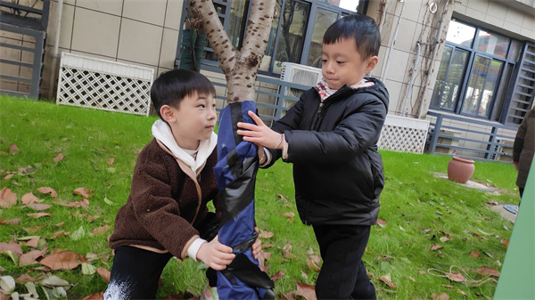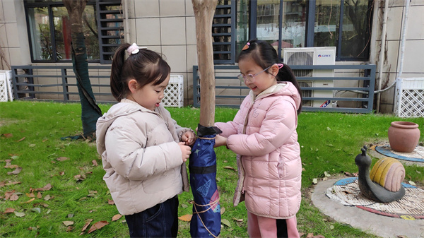 通过此次随机生成的探究活动,孩子们不仅在探索中发现树木过冬的保暖方式,更重要的是,孩子们通过直接感知、实际操作和亲身体验获取新经验,从而在有意义的活动中实现新经验的重构。丰富了孩子们的生活经验,更让孩子们在爱护自然中体验着劳动的快乐。一日生活皆教育,教育蕴含于生活之中,生活中的点滴发现,只要我们抓住契机,便是最好的教育。