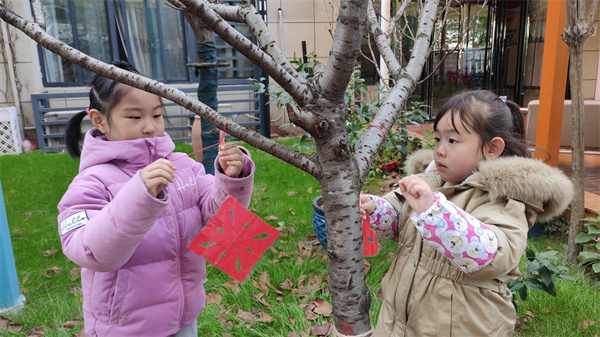 剪纸完成后,孩子们带着自己亲手做的礼物,来到小树旁,将礼物挂在了小树上,为小树送上最真的祝福!并开心地与小树合影留念。