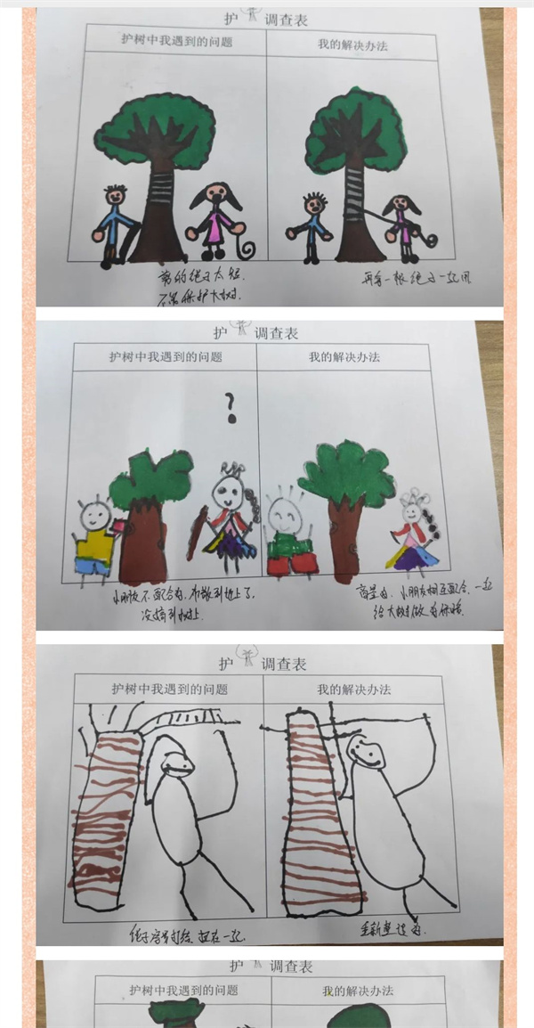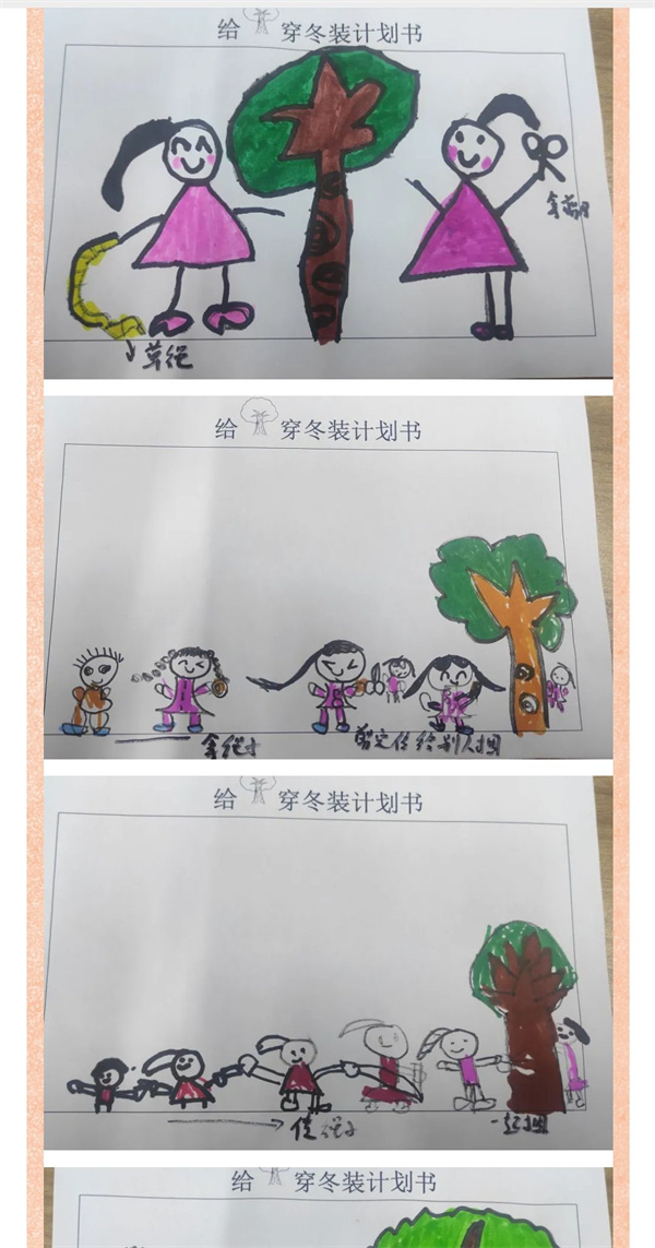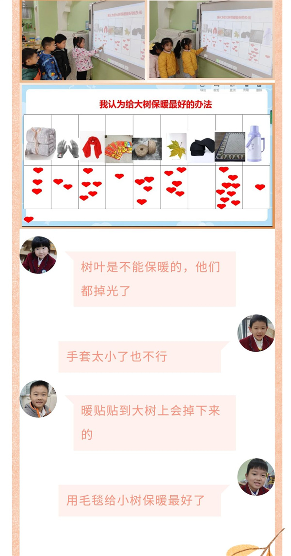 北风呼呼的吹着,像是冬爷爷吹的哨、唱的歌,为人们传递冬的讯息,冬爷爷的魔法棒一挥,大地褪去了金黄的外衣,带来了寒冷,大树的树干裸露在寒风之中,极有可能会被冻伤。这可怎么办呢?孩子们对此想了很多办法,并把自己的想法画了下来。聚焦问题,孩子们各抒己见,想出了很多办法,随后老师帮助小朋友们把想到的方法进行汇总,孩子们对这些方法进行了投票并展开了激烈讨论。
