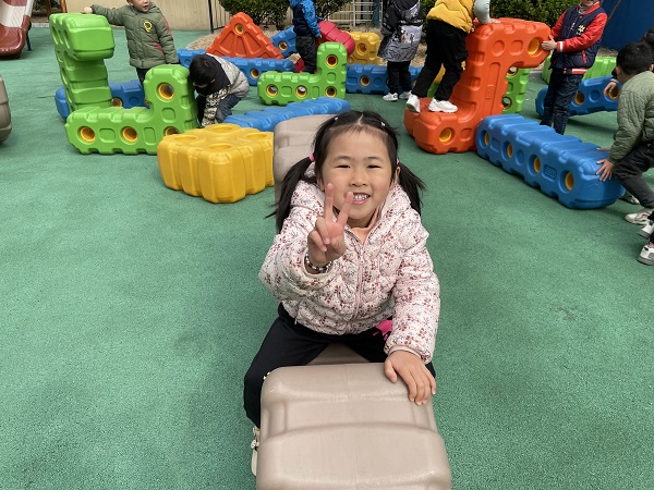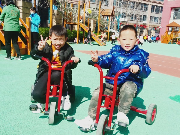 游戏活动前,教师带领幼儿进行了热身锻炼,操场上丰富趣味的游戏材料吸引孩子们跃跃欲试。幼儿很喜欢操场的户外活动,在大型积木上留下了他们灿烂的笑脸,小车上是他们互相帮助、分享小车的快乐身影。