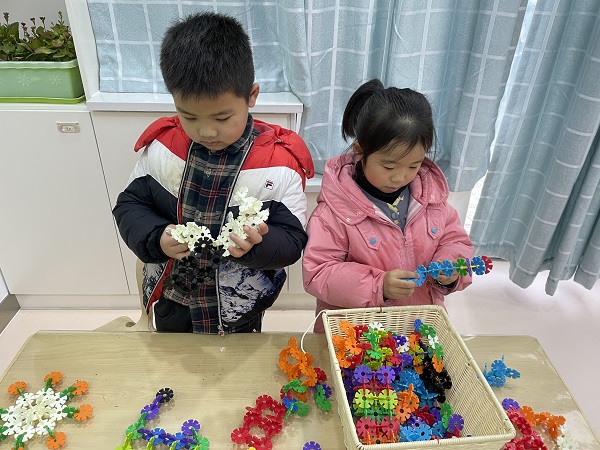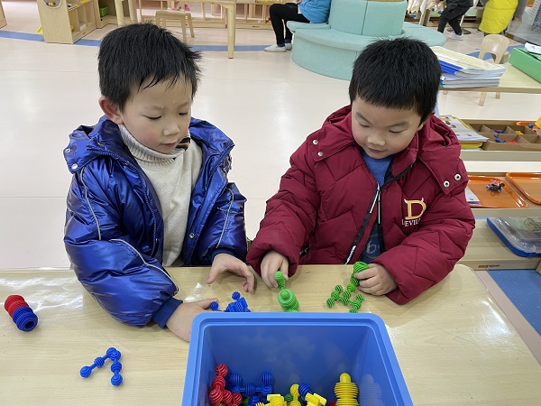 充满魅力的益智区给了孩子们一把开启智慧之门的金钥匙,幼儿通过手脑并用操作材料进行逻辑思维的训练,在数、形、空间的感知过程中培养逻辑思维的能力。结构游戏是幼儿利用各种不同的结构材料,经过创作反映周围现实生活的游戏。