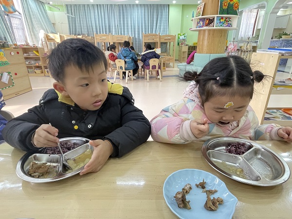 老师们及时抓住幼儿上午点心和中午用餐前的时机,通过故事、集体讨论等方式,让幼儿了解正确的用餐方法、就餐的坐姿、礼仪等,同时懂得饮食搭配营养的道理和爱惜粮食的重要性,不挑食、不浪费。