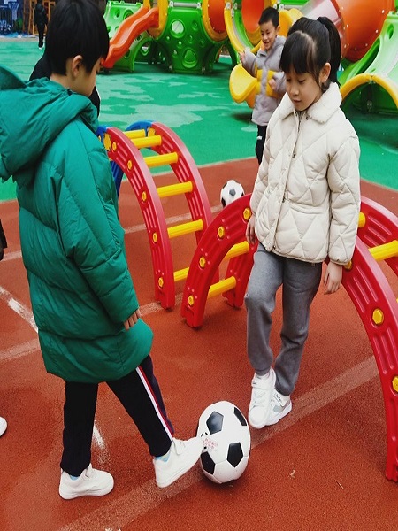 活动中,班级老师为孩子们简单讲述了足球的起源以及历史,并让孩子们在游戏中感知足球,尝试合作配合去踢足球,班级老师还详细讲解最基本的足球技术动作,并逐步分解逐一进行了示范。整个活动中班级教师主要以足球游戏的形式带领孩子们一起玩足球,在游戏中幼儿学习了基本动作,培养了幼儿对足球活动的兴趣,让幼儿体验足球游戏的乐趣。