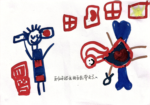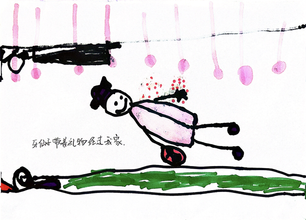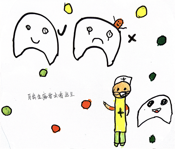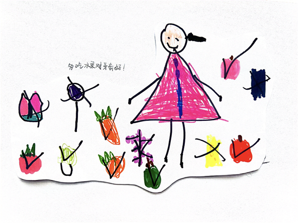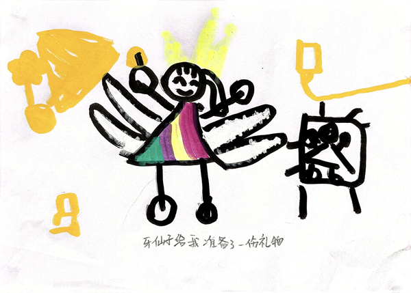 结合幼儿的关注点,在绘本故事《牙仙子的奇幻之旅》的阅读中,幼儿们知道了如果自己的牙齿掉了就要把掉了的牙放在枕头底下,这样牙仙子就会来了。“哇!牙仙子有翅膀呢!”、“牙仙子会用礼物兑换我们的牙齿吗?”带着美好的愿景, 幼儿们用绘画的形式将自己对换牙这一过程以及对故事中牙仙子的畅想进行了呈现,表达了对成长的无限期许。