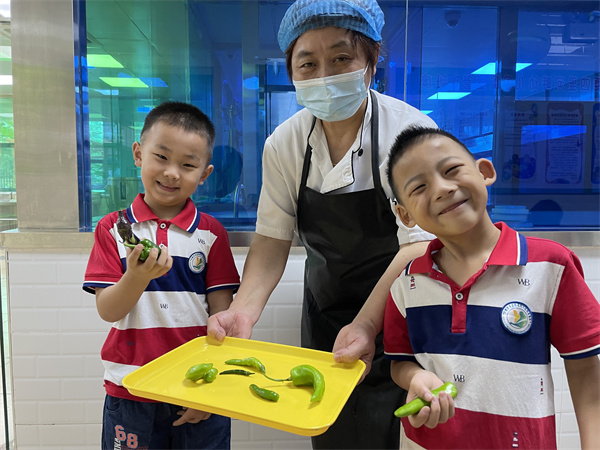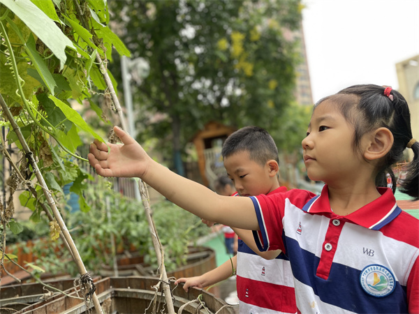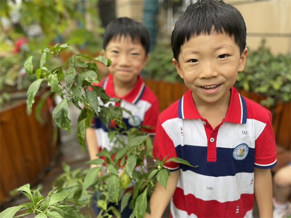 户外活动时,帆帆和阳阳不约而同的来到小菜园,看着高高的黄瓜架子如有所思。不一会儿便有更多的小朋友围到小菜园边,熙熙指着丝瓜花说:“这个黄色的小花花真好看。”诺诺抬着头感叹道:“这个丝瓜的藤蔓爬的真高呀。”孩子们你一言我一语,对长势喜人的丝瓜十分感兴趣,于是告诉孩子们一个小秘密。这个丝瓜之所以能长这么高这么健康,是因为暑假保育老师定期给它们施肥养护。宝贝们纷纷夸赞保育老师真厉害,保育老师天天照顾幼儿园的植物朋友真辛苦。嘉嘉说:刘老师太辛苦,要照顾我们还要照顾幼儿园的植物,我明天早上要帮刘老师挂毛巾。”瑞瑞急切的说:“那我明天帮刘老师收晨检牌。”一旁的刘老师欣慰的点点头,露出慈爱灿烂的笑容。楠楠又发现了新宝藏,成熟的辣椒和茄子,我们采摘一番并交给了食堂阿姨。