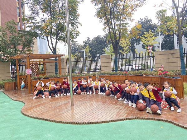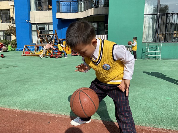 孩子们自选材料,在大型攀爬架上进行钻、爬、攀登等平衡动作的练习,发展身体素质的同时,同伴之间团结有爱、勇敢及克服困难的良好品质也相应得到发展。篮球也是大班孩子爱不释手的游戏材料,他们时而身体下蹲,时而抱球跳跃,从单手拍球到双手拍球,从一个球到两个球,动作有模有样,在一旁的小观众看的津津有味,掌声、笑声在操场上久久回响,让整个幼儿园变成了欢乐的海洋。