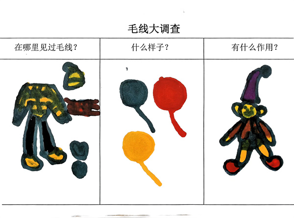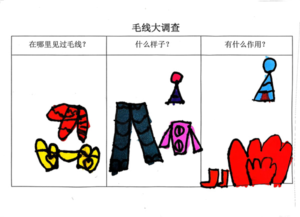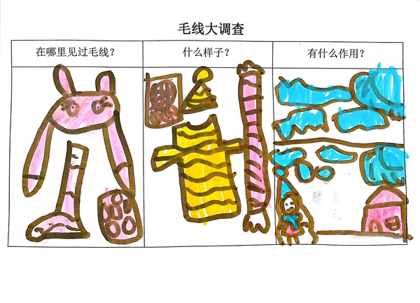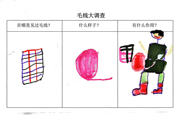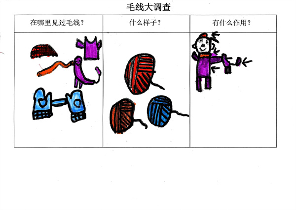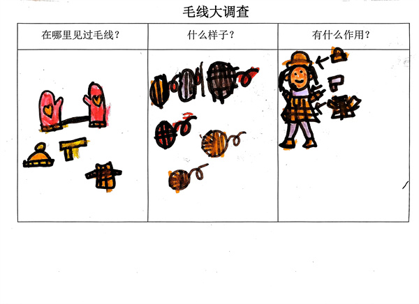 生活中有多种多样的毛线,基于孩子的前期经验和讨论,我们以调查表的形式展开探索,让他们亲自去感知、触摸各种各样的毛线,并将查阅和收集的资料以绘画表征的方式记录了下来。