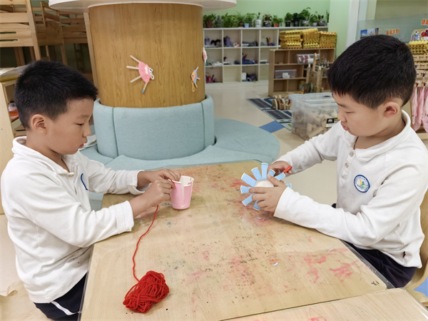教师思考:关于毛线的探索,我们从简单的寻找开始,在一日生活、区域活动、艺术活动等各个方面支持孩子的探索,多角度展开活动。对于孩子来说,在游戏中获得的认知是一个自然而然的过程。在活动中老师没有直接告诉幼儿该怎么做,而在指导幼儿活动过程中,让幼儿发现问题、讨论方法,从而让幼儿去思考,让幼儿在自己探索中主动学习。