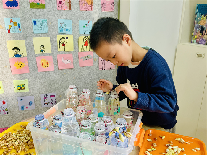 在值日生们的轮流照顾下,花生发芽啦!孩子们开始选择种子、给自己花生搬家啦!