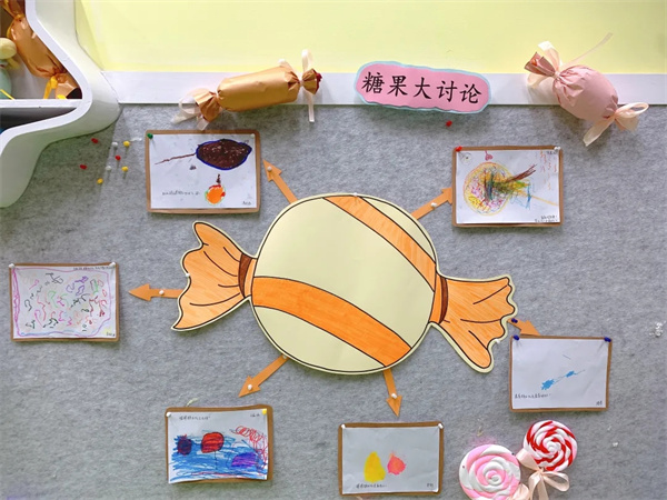 为了营造更好的环境氛围,孩子们积极参与“糖果世界”的装扮,灵巧的小手与老师们一同制作粘土棒棒糖,各式各样的糖果手工悬挂在班级各处,孩子们一抬头便是一场甜蜜的惊喜。