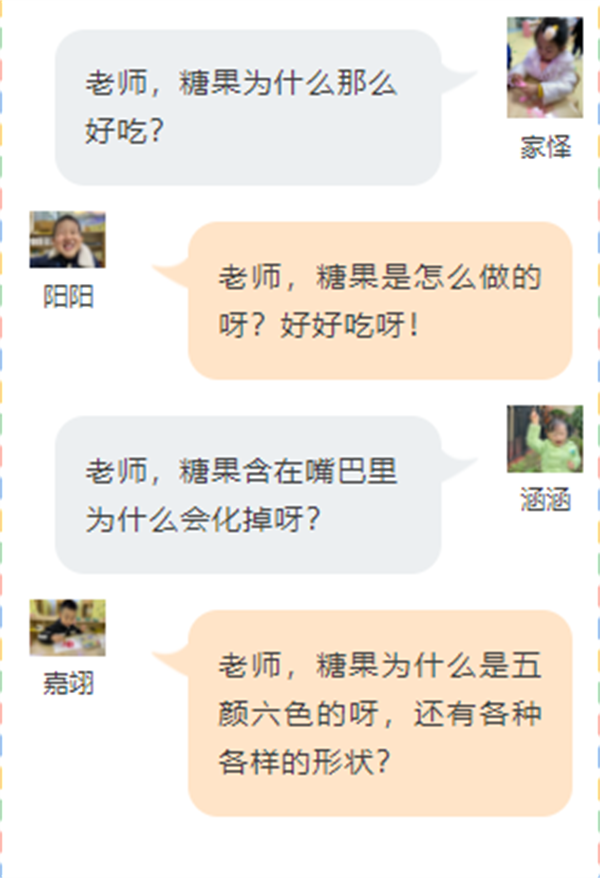 孩子们的童言童语总是生动有趣又富有想象力,那孩子们在对美味的糖果有了初步的认识后,他们对糖果有什么想进一步去了解的内容的呢?一场“关于糖果你想了解什么呢?”的谈话会开始啦!
