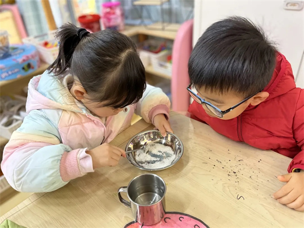 当奇妙的化学反应呈现在孩子们的眼中时,我们看到的是孩子们对于奇妙又多彩世界的感慨和满满的探究欲望。有时候我们不需要说,静静的去观察发现孩子们的发现,便会感知这个世界的美好了!“我是一颗糖,一颗什么糖?我是一颗活力四射的跳跳糖!”孩子们化身成会在嘴巴里跳舞的跳跳糖,将自己兜在布袋里开心的和自己的好朋友来一场速度大比拼。