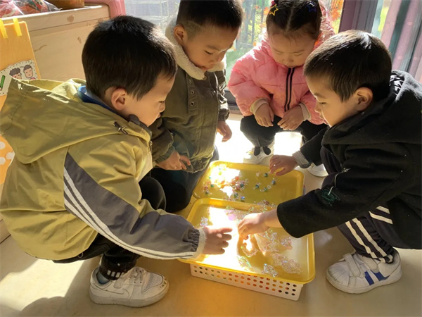小树:“老师,你快来看,糖果纸在阳光下会变颜色耶!”午餐结束后,孩子们,发现美工区的糖果纸在阳光下闪闪发光,都围上来叽叽喳喳的讨论了起来!孩子们拿着彩色的糖果纸在阳光下仔细的观察着。老师,你看,糖果纸在上面的时候是蓝色的,在下面的时候是红色的,它会变色耶!”糖果纸在阳光下会发生奇妙的碰撞,那五彩缤纷的糖果遇到了水会有什么样的奇遇的,孩子们都好奇的凑了过来。