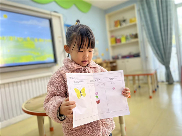 伴随着对蝴蝶的好奇,宝贝们围绕蝴蝶展开了一场探究活动,大家通过观察蝴蝶标本、翻阅蝴蝶相关的绘本以及和爸爸妈妈一起做调查的方式了解了蝴蝶的身体结构、生长过程等内容。“原来,蝴蝶的一生包括卵、幼虫、蛹与成虫四个阶段,先是由虫卵变成毛毛虫,小毛毛虫吃了很多树叶不断长大,然后结成蝶蛹,毛毛虫在蝶蛹里睡上一个大觉,之后经过羽化变成美丽的蝴蝶,这时蝴蝶就不再吃叶子了,而是靠吸食花蜜来填饱肚子。得知了这个消息,宝贝们纷纷表示要在班级的种植区种满美丽的鲜花,这样明年春天蝴蝶飞来的时候,就可以用美味的花蜜来招待它啦!