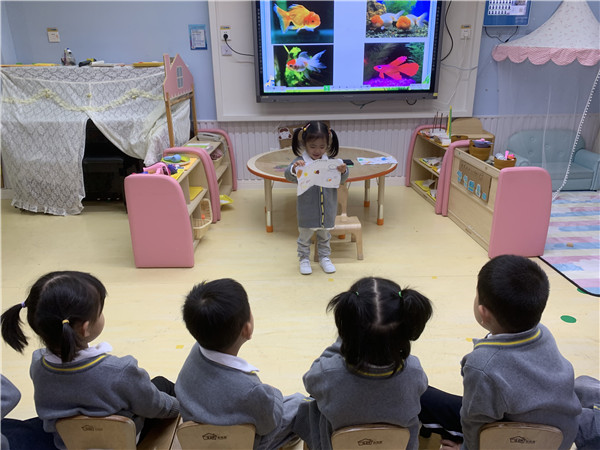 孩子们每天都会绕到小金鱼的身边叽叽喳喳的说个不停,有一天墨墨小朋友站在鱼缸旁边突然很伤心的说:“小鱼怎么一动不动的是不是死了呀!”旁边的棠棠说:“它在睡觉呐!”“不对,小鱼睡觉怎么不闭眼睛,也不像我们一样躺下来呢?”墨墨反问道,一场关于小金鱼怎么睡觉的讨论开始了,“你觉得小金鱼是怎么睡觉的呢?”当老师抛出问题的时候,孩子们开动自己的脑袋还有小身体模仿了起来。“小金鱼是像我们一样闭上眼睛躺着睡觉的!”“小金鱼是趴着然后睁着眼睛睡觉的!”为了让孩子们的争论得到解答,老师带着孩子们观看了相关的科普小视频解了小金鱼的身体构造,揭秘了小金鱼在睡觉的时候的秘密,原来它们睡觉的时候是睁着眼睛静止不动的。