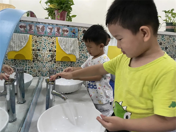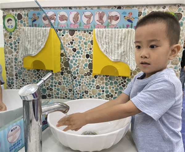 第一次老师帮我洗小手,七步洗手法我已经慢慢学会了,我很棒吧!