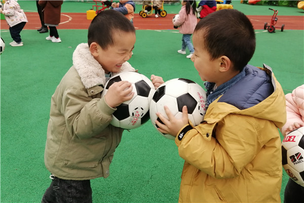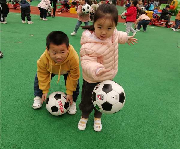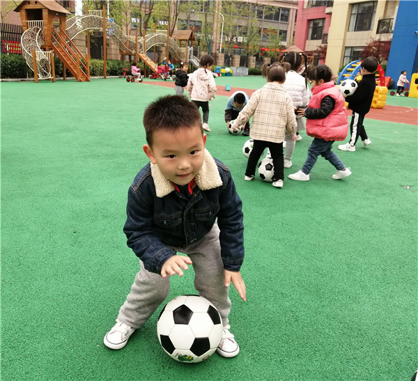 活动开始前,教师带领幼儿进行热身运动,热身结束后,教师引导幼儿共同学习足球最基本的踢,幼儿参与积极性很高,跃跃欲试,宝贝们在教师的带领下,感受足球的无限魅力,通过滚球,踢球等各种方式来感受足球的特点,还和同伴合作相互玩耍,在游戏中不断的尝试,发现足球的各种玩法,小小的足球在宝贝们的手中充满了灵动和生气,操场上也充满了欢声笑语。