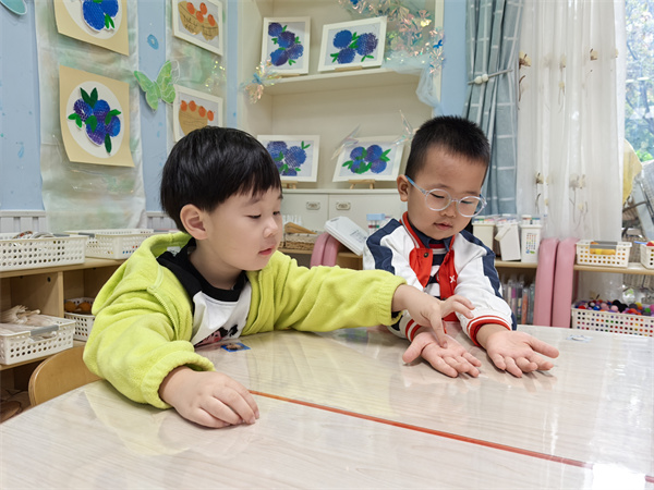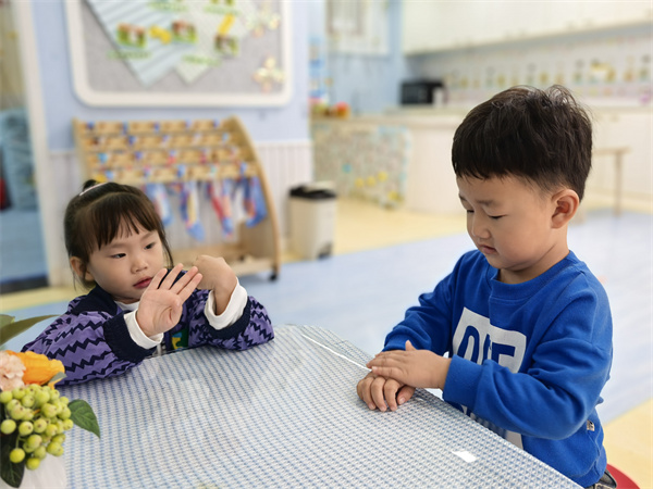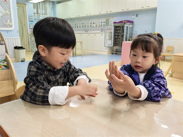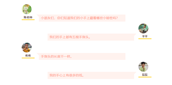 追随着孩子的兴趣,老师们带领小朋友们认识小手。通过生动有趣的图片和游戏,小朋友们了解到自己的小手有五个手指头,分别是大拇指、食指、中指、无名指和小指。每个手指头都有自己的名字和独特的作用。小朋友们睁着大眼睛,充满好奇地观察着自己的小手,对这个小小的身体部位有了更加深刻的认识。