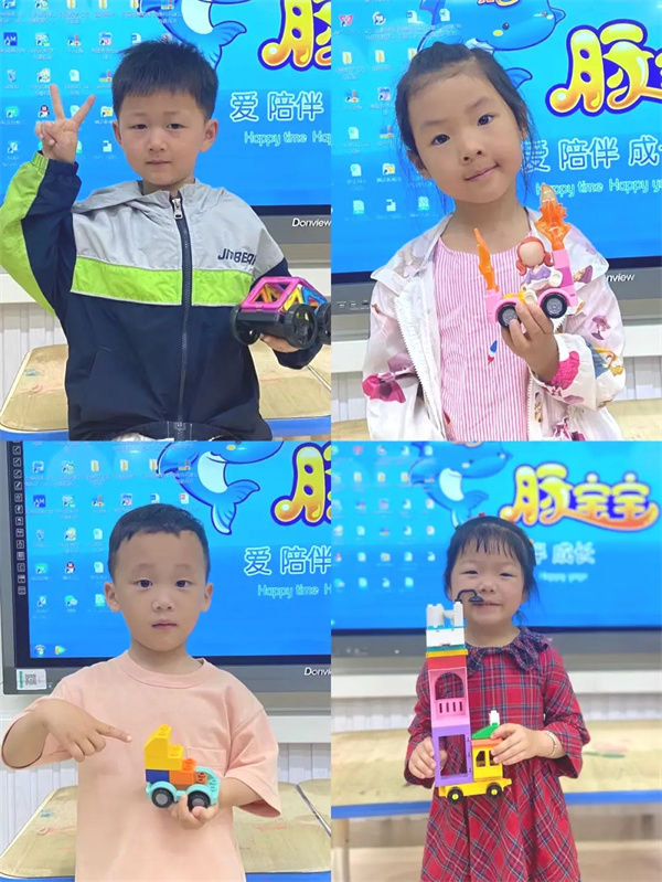 孩子们兴致勃勃,自信满满。各个都取来自己所需要的材料,制作搭建汽车。典型的三类材料:磁力片、积木、黏土。制作完成后,老师邀请小朋友们对自己的作品进行解说展示,恒屹和知晗的磁力片汽车得到孩子们的赞赏。
