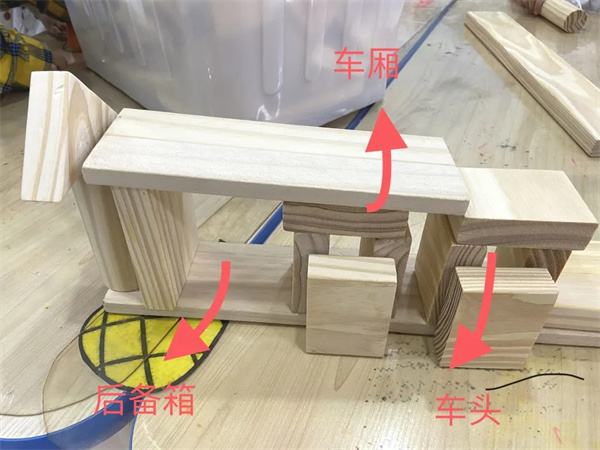 借来了轮子之后,孩子们的创作欲望更加浓厚。在一双双巧手下,各式各样的小车逐渐成型,孩子们根据自己的兴趣倾向搭建、创造。小货车、带尾巴的小拖车、三角形的两轮车、小火车,还有功能性较多的房车……