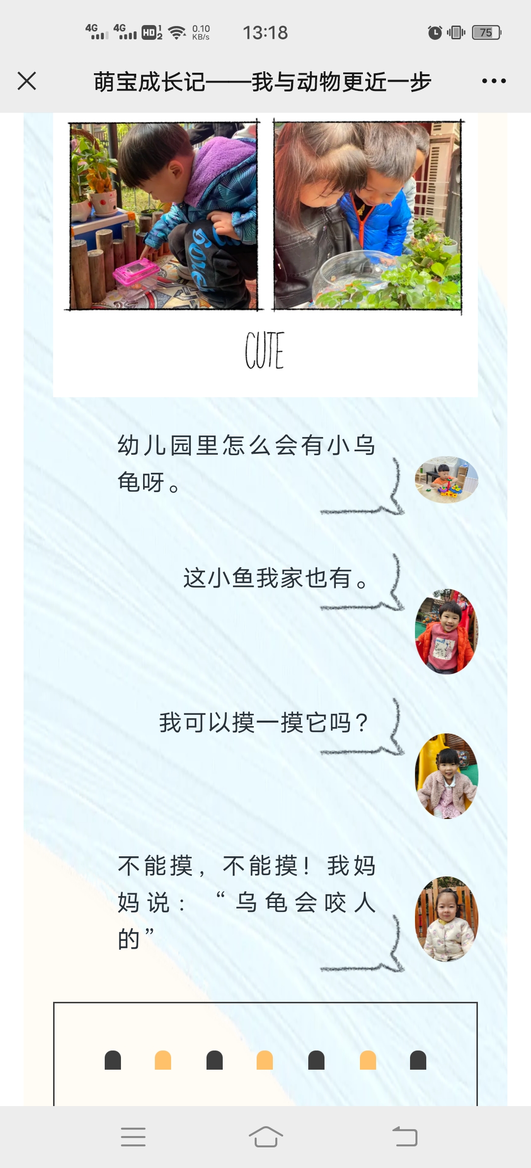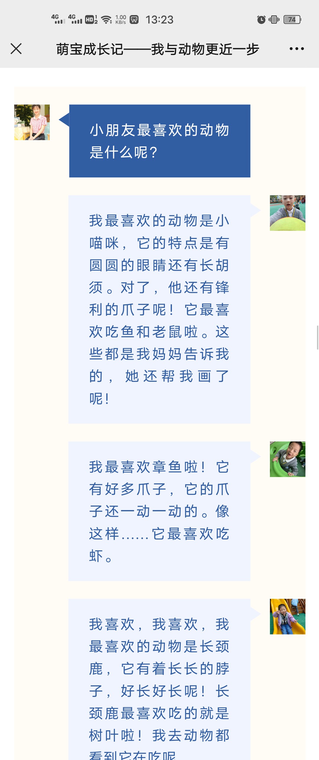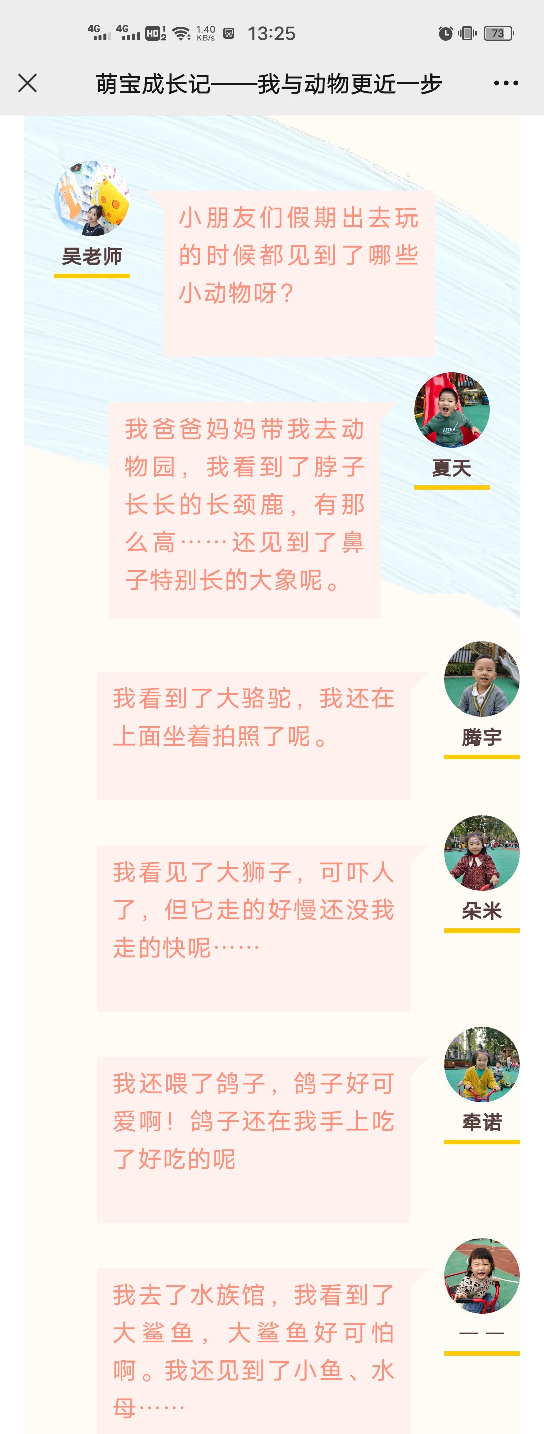 2021年10月4日是世界动物日,正值十一假期,庐实幼四里河畔小四班的小朋友在家长的带领下与动物进行了亲密接触,也在小朋友的心中留下了深刻的印象。在与动物接触之后,小朋友在家和在幼儿园的话题都离不开“动物”这个主题。老师听到小朋友的讨论,也参与了小朋友的谈话。