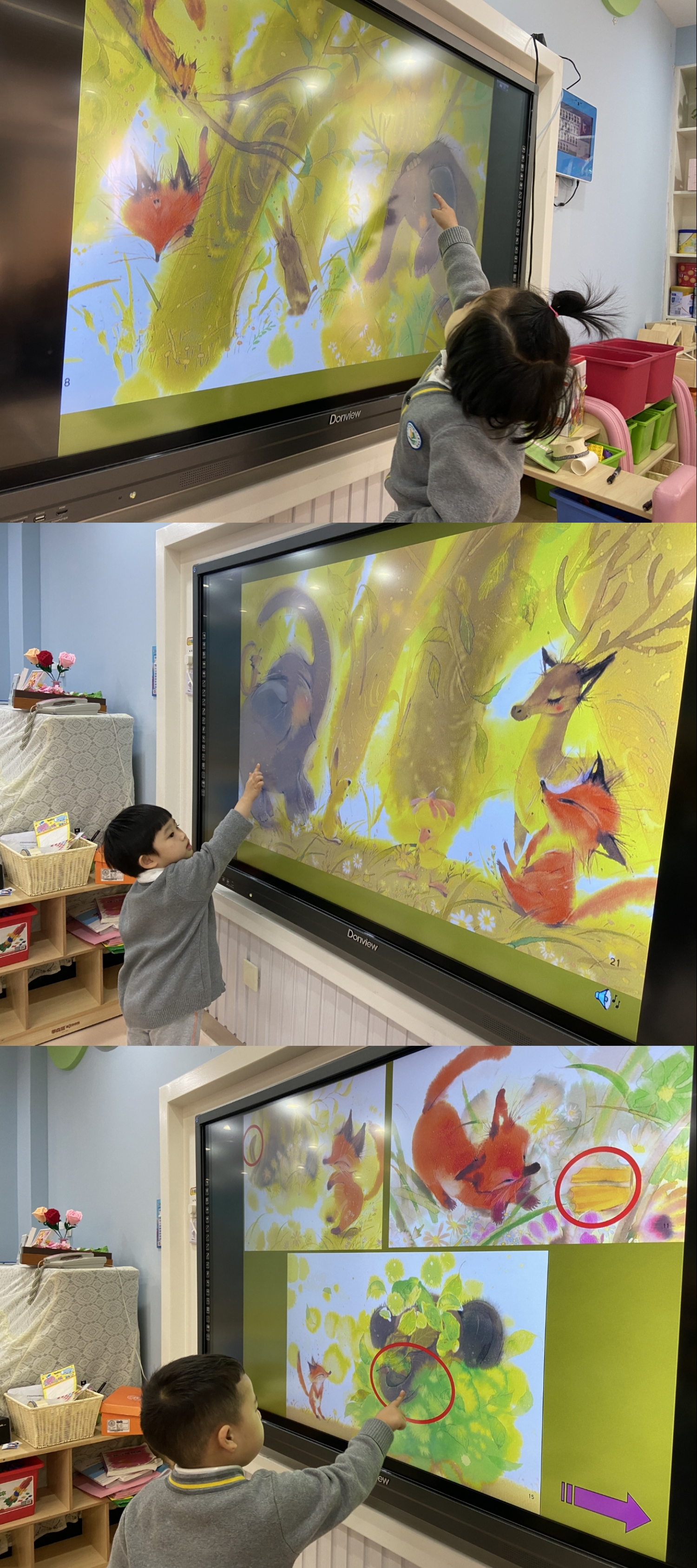 为了小朋友们更好地了解她们的“好朋友”老师带领小朋友们继续探索。让她们找找幼儿园什么地方还藏着小动物们的踪迹
