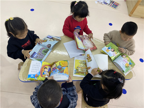 孩子们开心的来到图书区,选择了自己喜欢的绘本并安静的阅读图书。他们轻轻地翻阅着自己的绘本,看到精彩的地方还会轻声和同伴分享。每一本书他们都津津有味地看着,非常专注。看完一本,他们会和旁边的小朋友交换。活动结束时,孩子们在老师的引导下有序的把绘本图书放置在书架上。