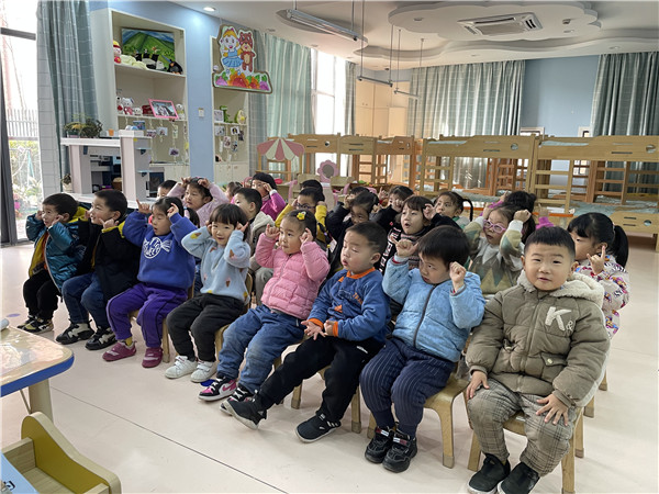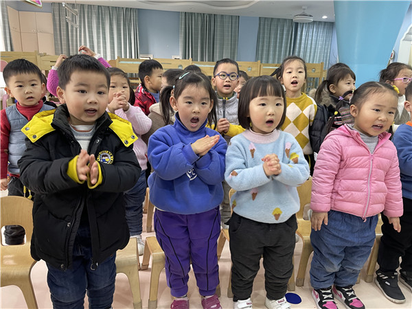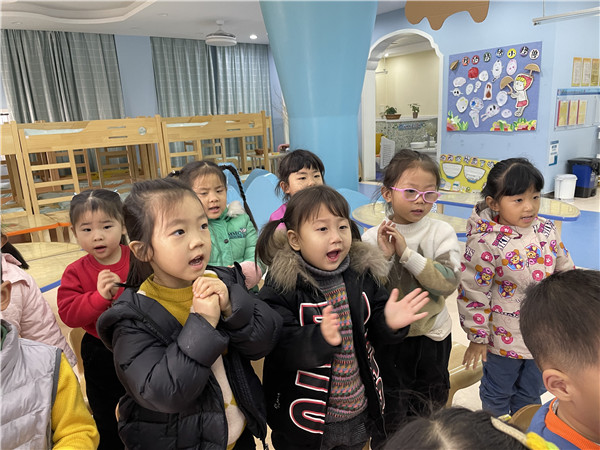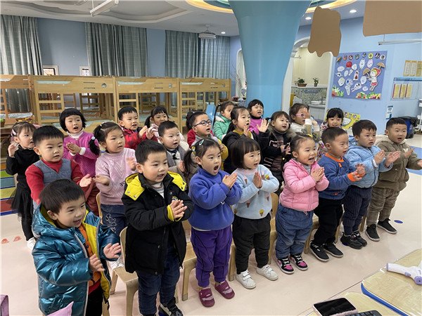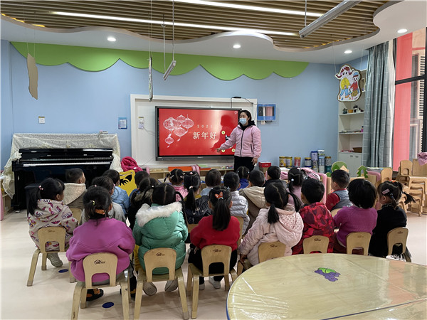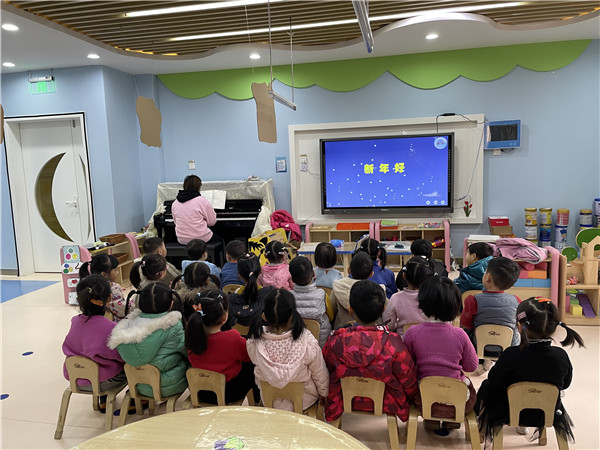 伴随着优美的钢琴声,宝贝们唱起了《新年好》,他们边唱边跳,开心地期待着春节的到来。