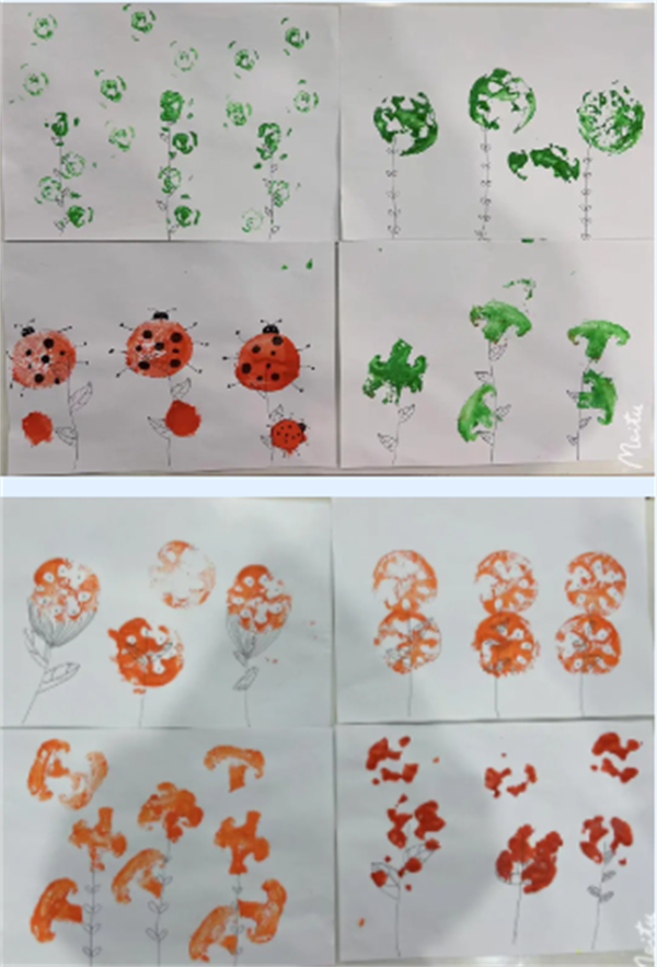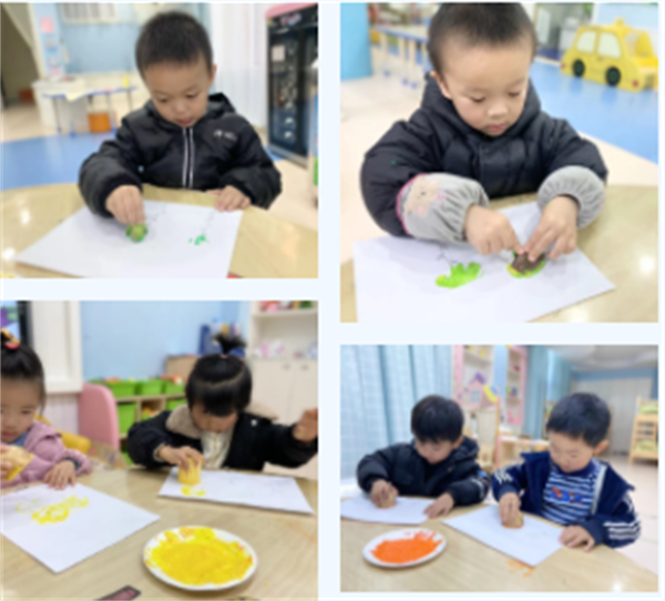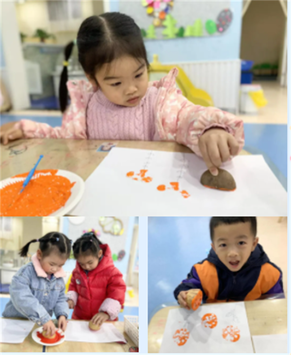 将蔬菜的横竖切面蘸上不同的颜料,在白纸上拓印,感知蔬菜的横竖切面。通过观察、操作、对比等方式,学习用各种维度观察看待事物的能力。