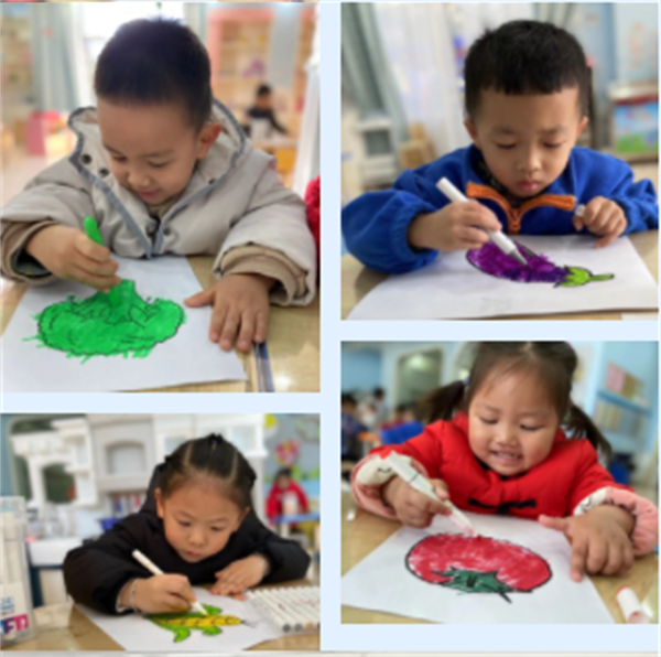 通过绘画、拓印的的形式让小朋友进一步认识蔬菜,使幼儿意识到蔬菜除了有营养、可以吃,还可以用来画画,让小朋友喜欢蔬菜。通过印画还可以锻炼幼儿动手操作能力和对美的感受力。