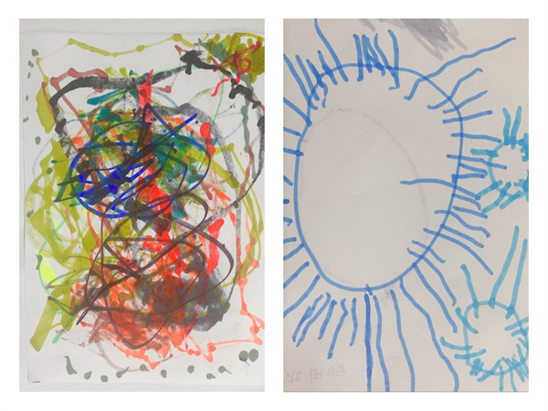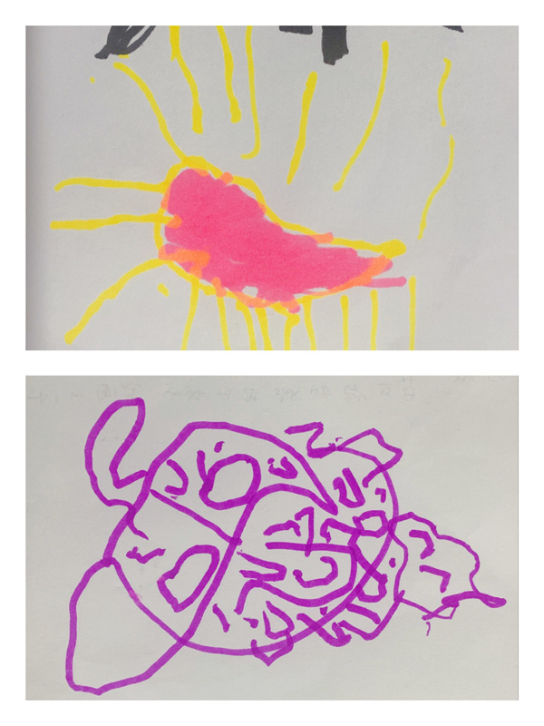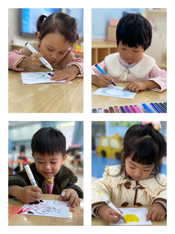 “老师为什么秋天到了树叶就会落下来呢?”有小朋友喊到。“因为秋天来了,天气变凉了,树叶就落下来”“是太阳把落叶踢下来了”“是月亮把树叶打下来了”,孩们争先恐后的回答。感动孩子们的这份天真无邪,为了将这份童趣保留下来,让她们自己动手将他们的想法画了出来,他们各种奇奇怪怪的想法跃然纸上。