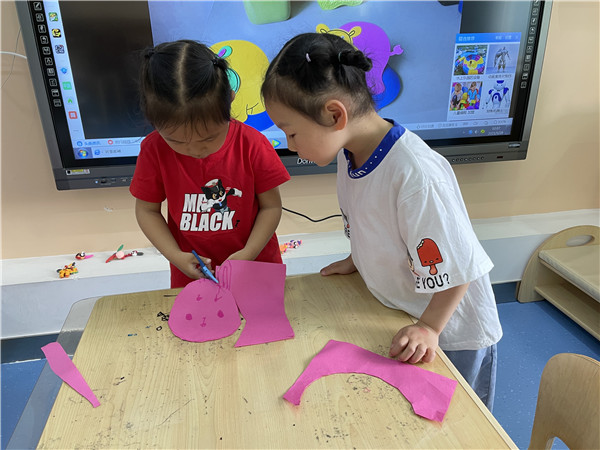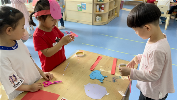 集体欣赏小演员的表演视频时,小观众指出小演员声音太小、看不出扮演的角色等问题。小演员们收到建议后,积极开动脑筋,自主设计并制作了游戏头饰、道具等表演材料,丰富有趣的游戏的材料极大地调动了幼儿表演的兴趣和欲望;经典而符合年龄特点的故事情节与对话让幼儿在自主选择与自由表现中时时迸发想象和创造的火花;幼儿完整而流利的表达、惟妙惟肖的动作与表情感染了在场的每一位小观众。大家沉浸于小演员们的精彩演绎,感受游戏的快乐!